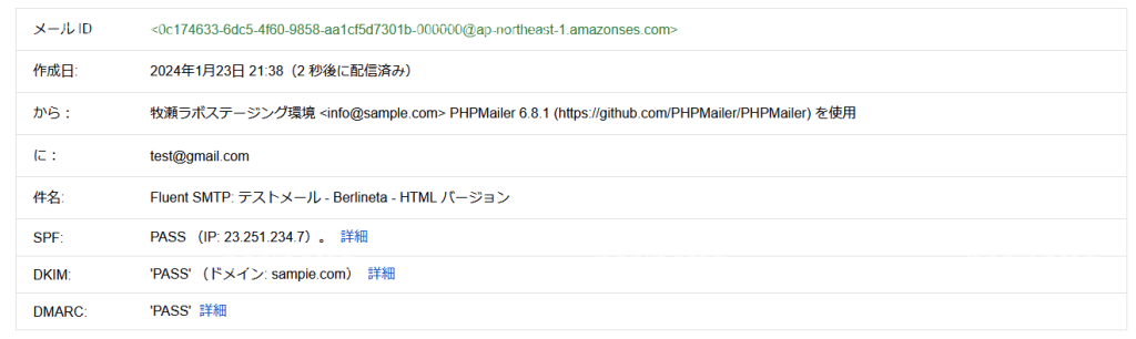 SPF,DKIM,DMARCがすべて「PASS」となっていれば、設定は完了です。
