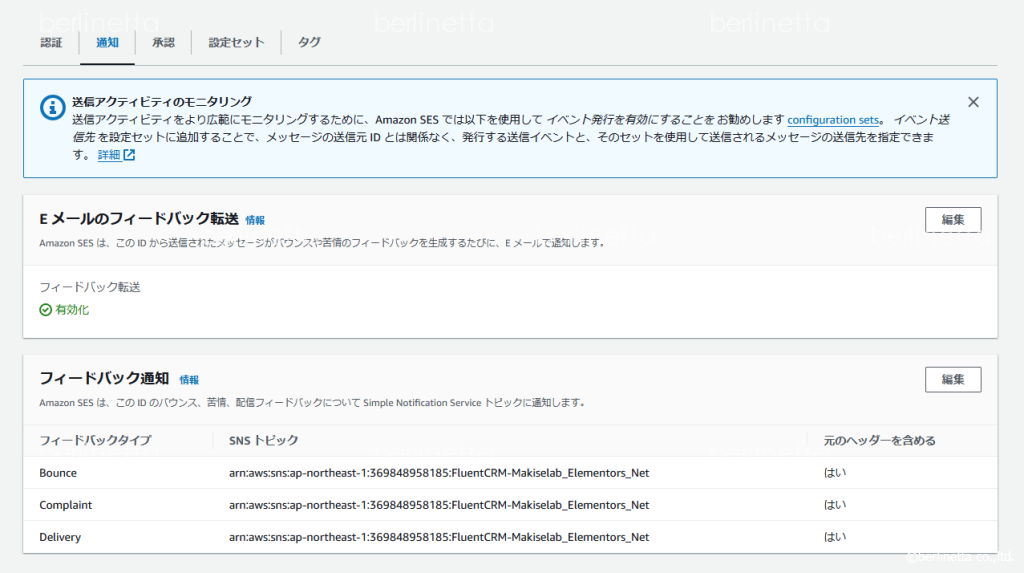 「通知」タブを選択して、「フィードバック通知」の編集から、バウンスフィードバック、苦情のフィードバック、配信に関するフィードバックを、最初に作成した「AmazonSESの権限を付与したユーザー」に設定します。
