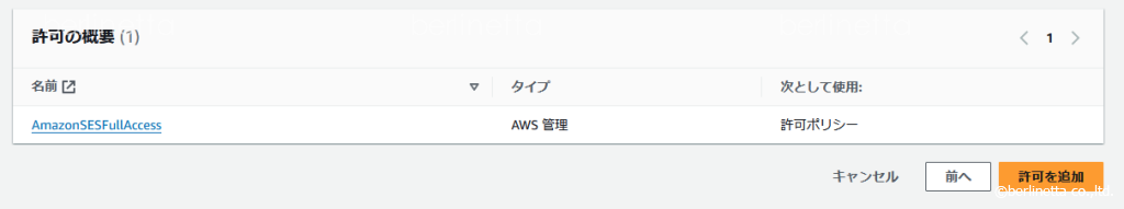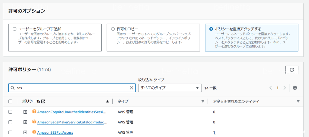 ポリシーを直接アタッチから、「AmazonSESFullAccess」を追加します。