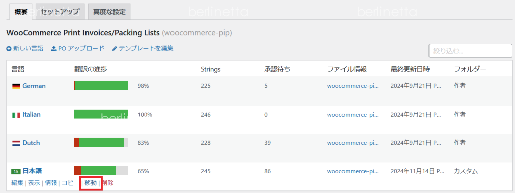 「LOCO」のプラグインを開くと、「Wordpressアップデートのためにファイルが削除された可能性があります」等といった血の気が引くようなアラートが上がっていますが、実際に翻訳ファイルが削除されることは無く、過去のバックアップもしっかりと残っていますのでご安心ください。